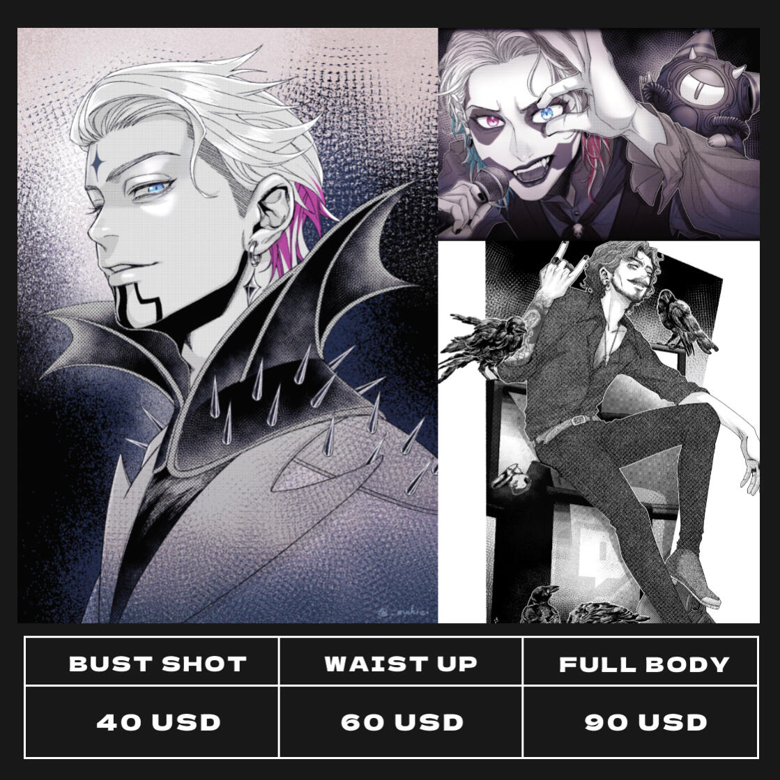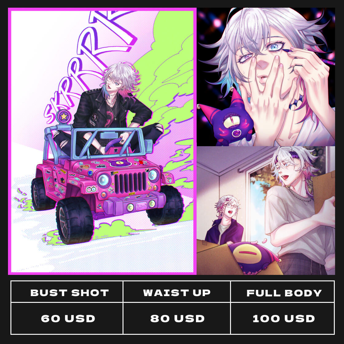 ✦ Humanoid characters, fanarts, OCs, characters with animal ears, tails, fangs, wings, and small pet companions are OK✦ My specialty is drawing modern setting, fashionable themes, and characters (streetwear, punk, Y2K...)✗ Realism, elderly, infant, furry, big creatures, extreme gore or violence✗ Complex mecha designs (robots, big vehicles, etc), heavy armor⇒Designs that high fantasy & ancient themes are not recommended.